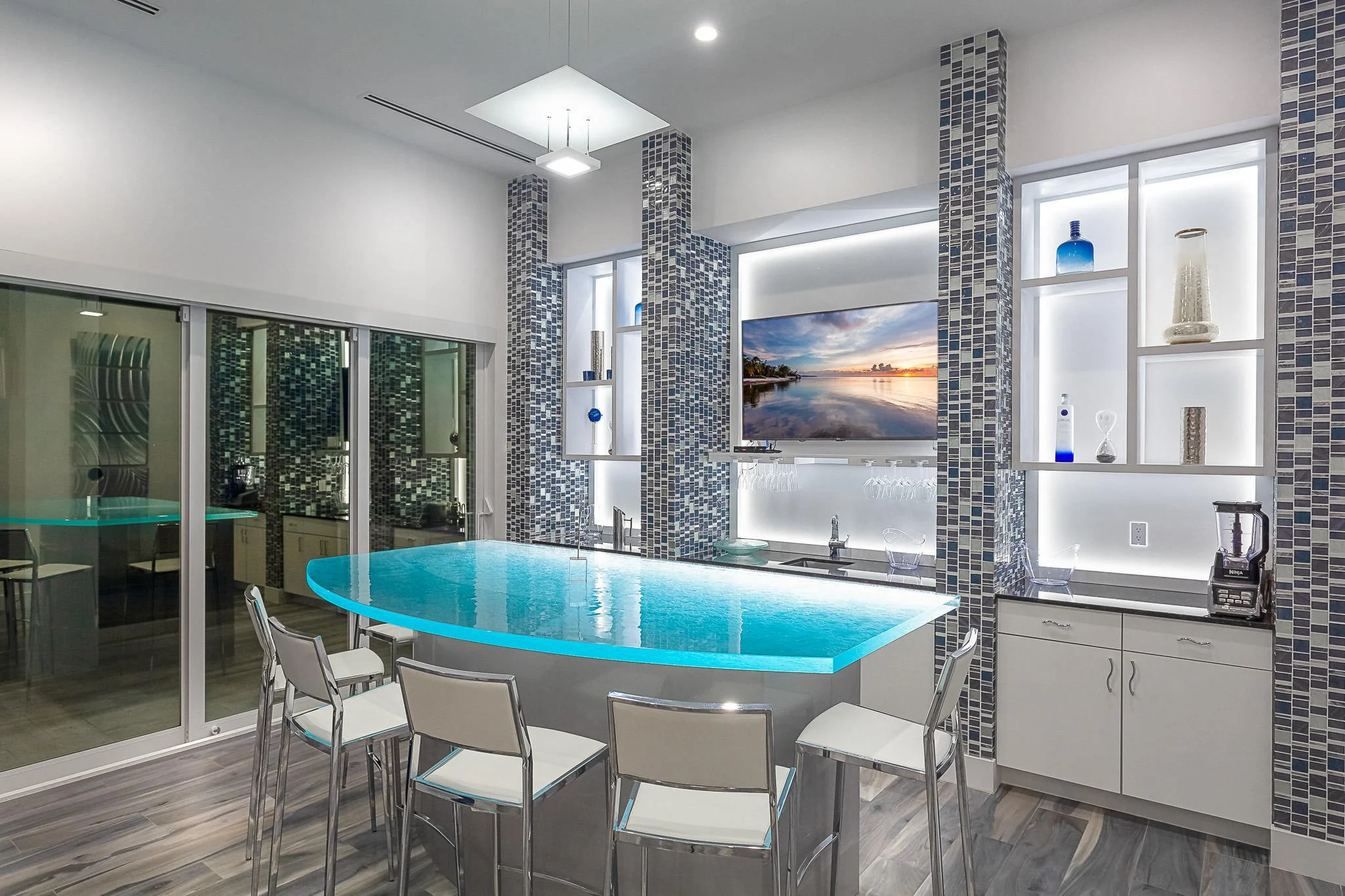 Modern kitchen with a blue-tiled island, white cabinets, and built-in shelving with decorative vases, a large window with a sunset view, and a flat-screen TV.